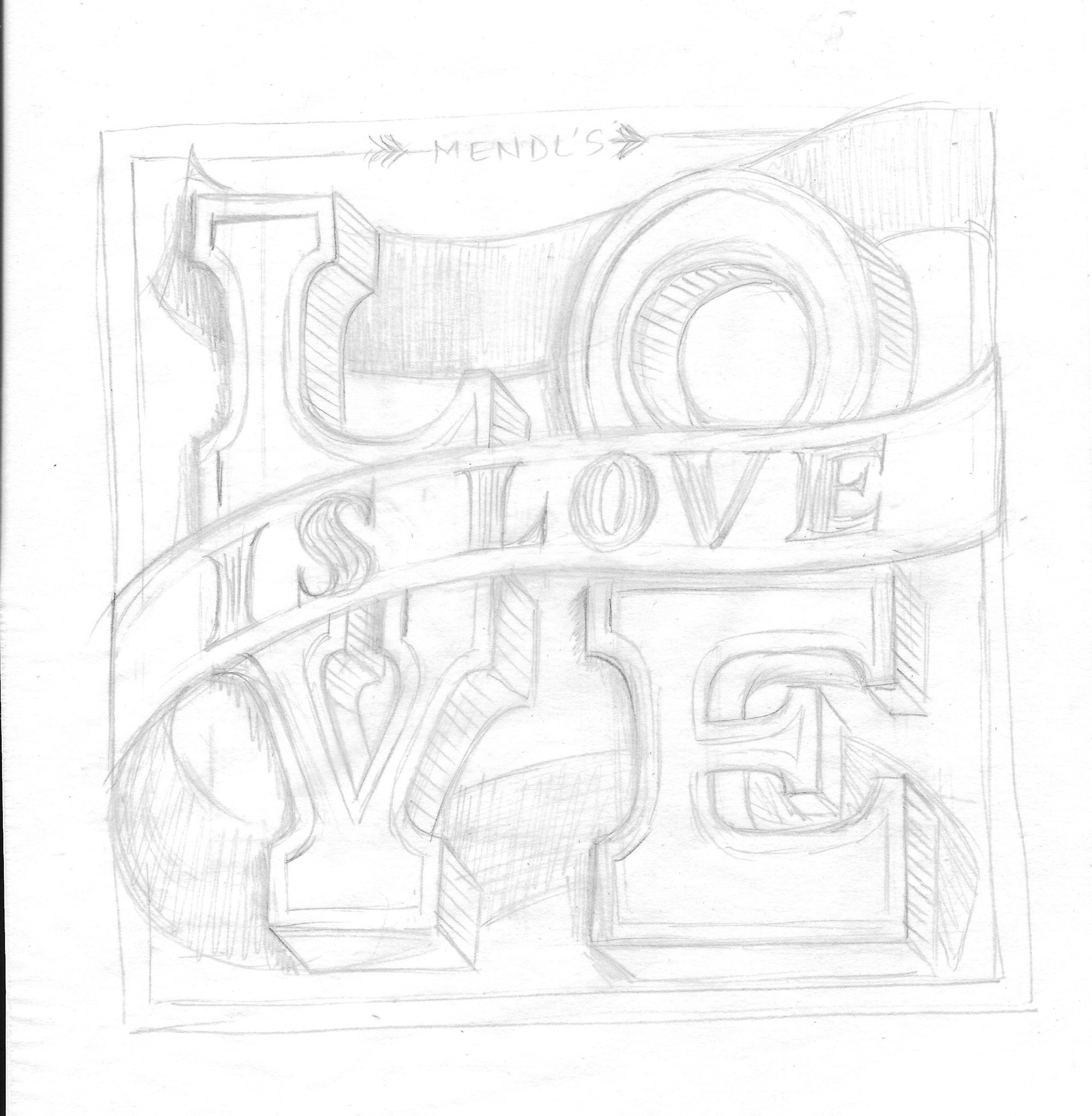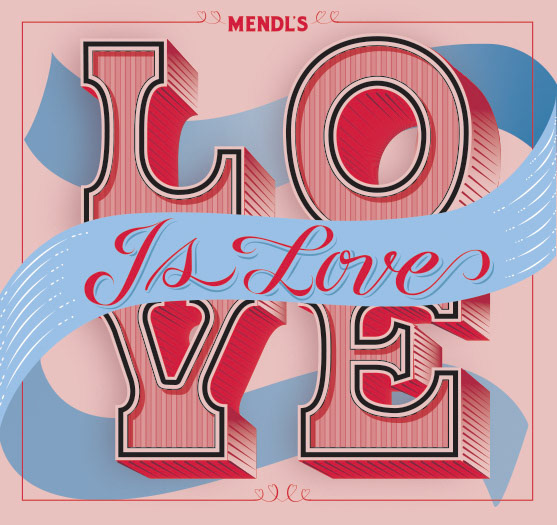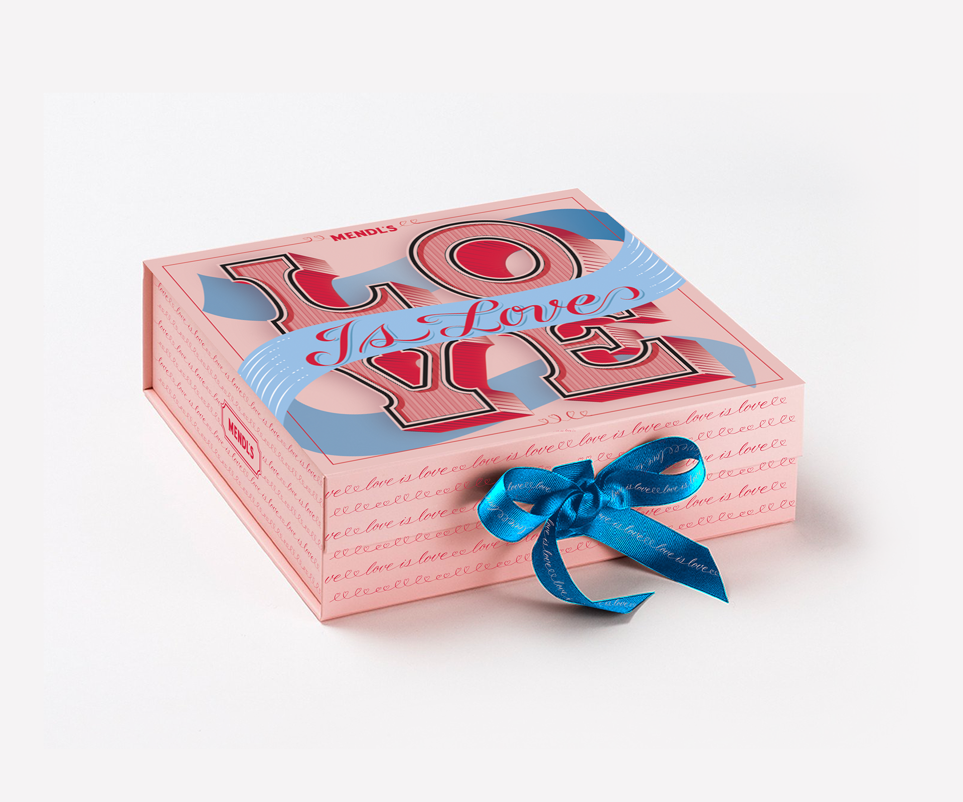 This project was developed as a holiday gift box. The iconic Mendl's ribbon was used to envelop the word love. A custom pattern was designed, using a delicate script and hearts of varying sizes to show that love comes in all sizes.